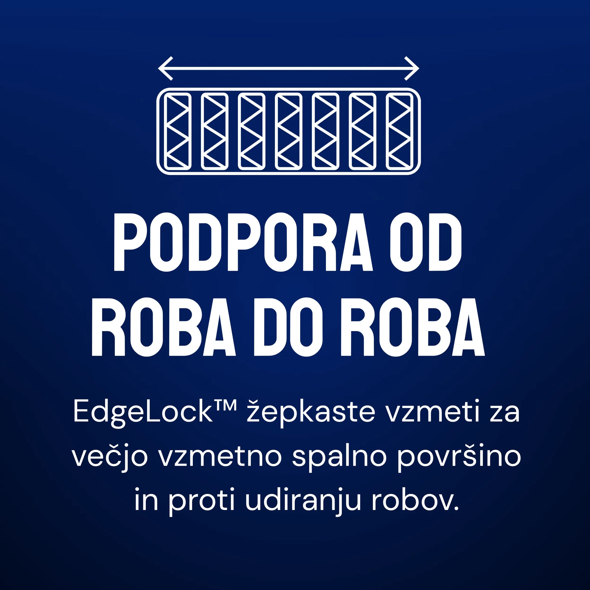 Jedro vzmetnice tvorijo napredne žepkaste vzmeti z nosilnostjo do 200 kg na osebo, zaščitene s plastmi CoreTex PS™, kar zagotavlja ergonomsko podporo, dolgo življenjsko dobo in tiho delovanje. Ob straneh je vgrajen EdgeLock™sistem za okrepljeno stabilnost.